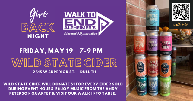 Wild State will donate $1.00 for every cider sold May 19th, 7 to 9pm to the Alzheimer's Association