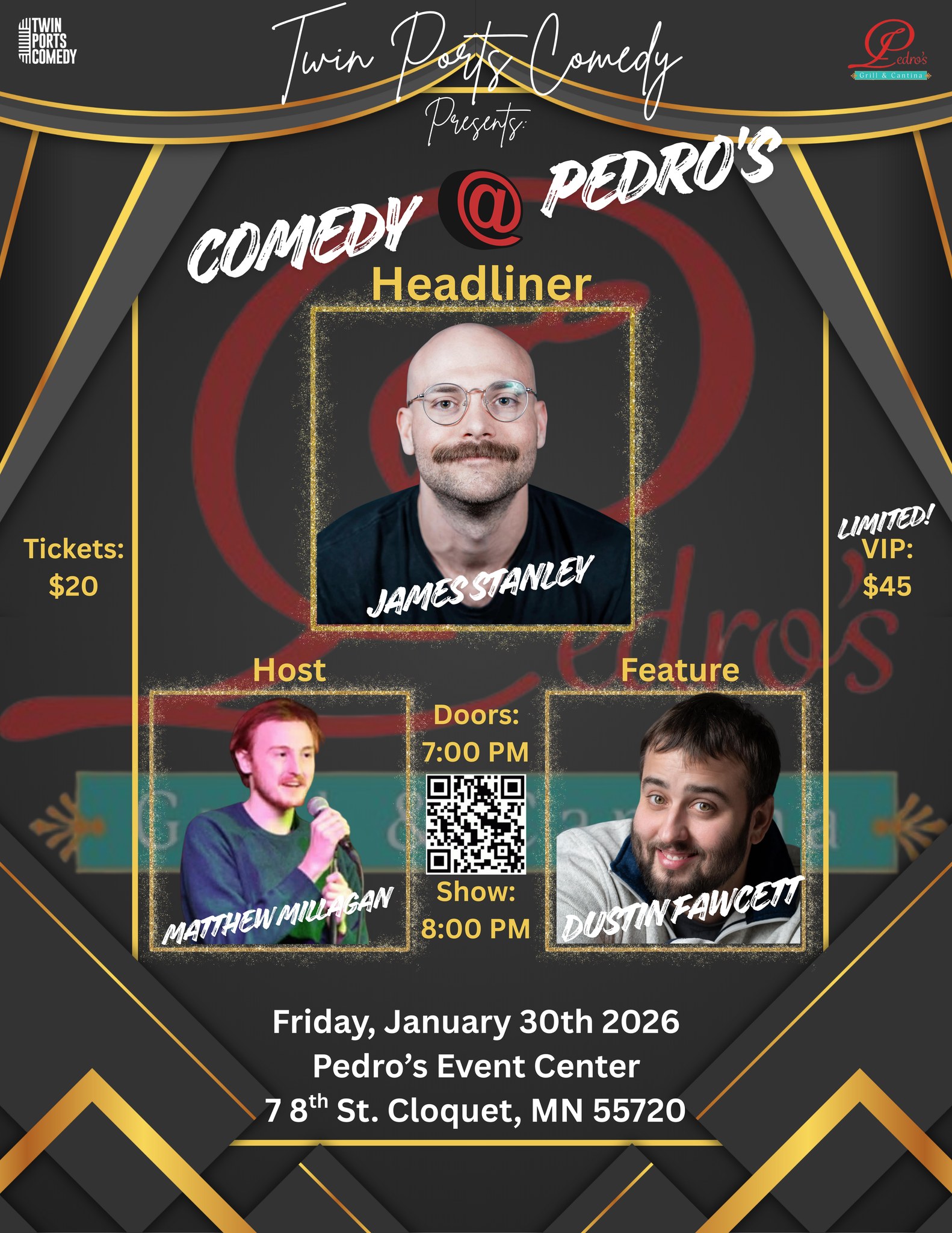 Come enjoy a night of laughter at Pedro's Event Center! Grab food before the show down in Pedro's Grill and Cantina or grab yourself a VIP ticket with private balcony seating, private bar, and food. Whatever your choice, you will be in store for a great time!